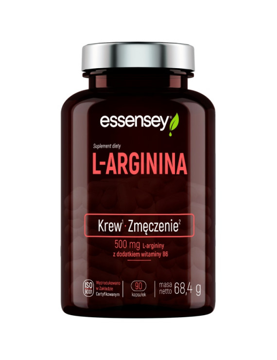 ESSENSEY L-ARGININA to suplement diety, który dzięki zawartości witaminy B6 świetnie sprawdzi się u osób chcących zadbać o układ krwionośny i nerwowy oraz zmniejszenie uczucia zmęczenia i znużenia.
