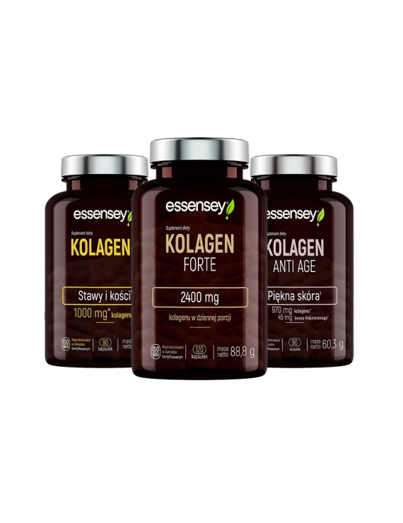 Suplement diety ESSENSEY KOLAGEN FORTE w 120 kapsułkach - suplement diety w postaci kapsułek zawiera 2400 mg hydrolizatu kolagenu typu I SOLUGELTM w porcji produktu zalecanej do spożycia w ciągu dnia.