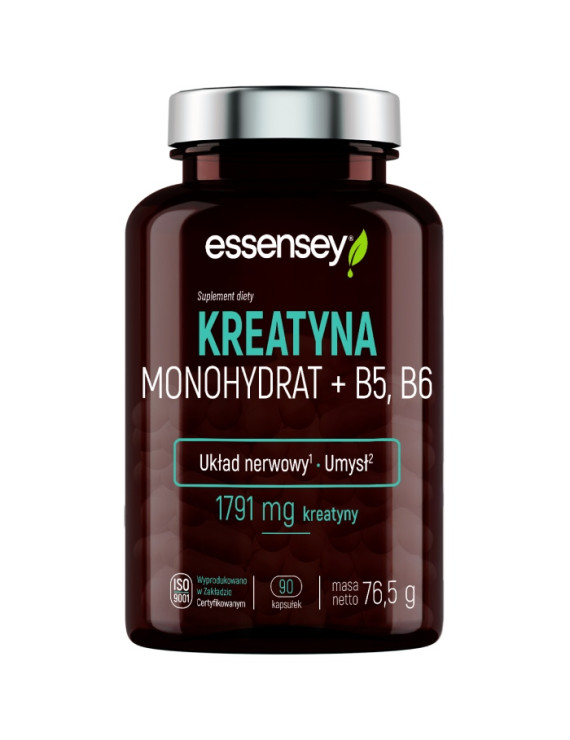 ESSENSEY KREATYNA MONOHYDRAT + B5, B6. Suplement diety w kapsułkach, zawierający kreatynę, kwas pantotenowy oraz witaminę B6.