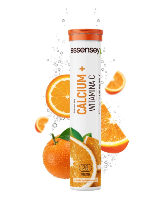 ESSENSEY CALCIUM + WITAMINA C. Suplement diety. Zawiera substancje słodzące. Produkt w postaci tabletek musujących o smaku pomarańczowym. W składzie znajduje się wapń oraz witamina C.