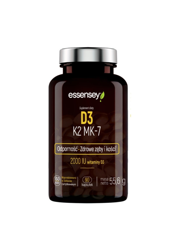 Suplement diety ESSENSEY D3 K2 MK-7 zawiera witaminę K2 oraz D3, która wspiera odporność oraz pomaga w utrzymaniu zdrowych zębów i kości 2.