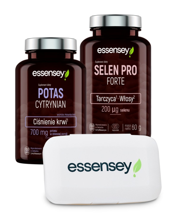 Suplement diety ESSENSEY SELEN PRO FORTE zawiera selen, który pomaga w prawidłowym funkcjonowaniu tarczycy oraz pomaga zachować zdrowe włosy i paznokcie 1.