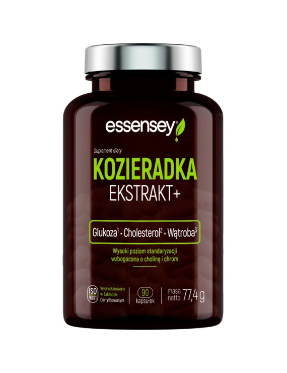 ESSENSEY KOZIERADKA EKSTRAKT + to suplement diety, który może stanowić uzupełnienie codziennej diety, zwłaszcza osób dbających o zrównoważony sposób żywienia. Dzięki obecności poszczególnych składników, świetnie sprawdzi się m. in. jako wsparcie w: utrzymaniu prawidłowego metabolizmu tłuszczów (cholina), fizjologicznej równowadze pH żołądka (kozieradka) i utrzymaniu prawidłowego poziomu glukozy we krwi (chrom).